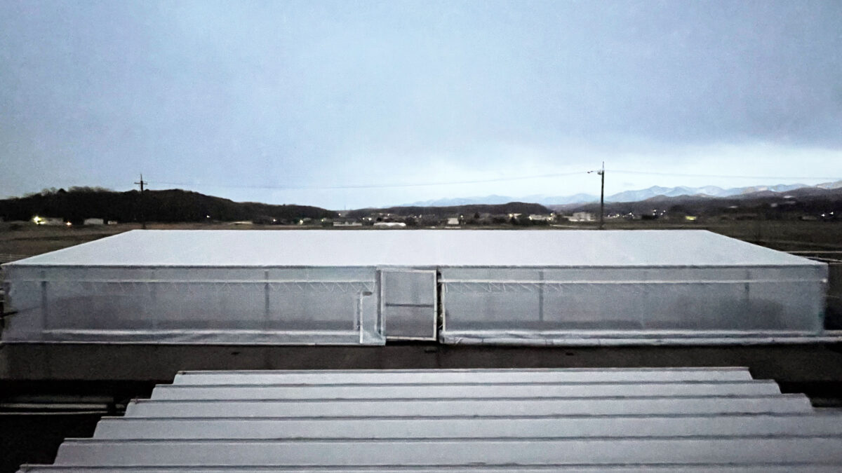 今回は天井も周囲も全てシートで囲っておりますが、細かく糸の入った半透明のような生地のため中に光を通すこともでき、厚みも約0.8mmと強度の高い屋外に適した生地を使用して製作しております。