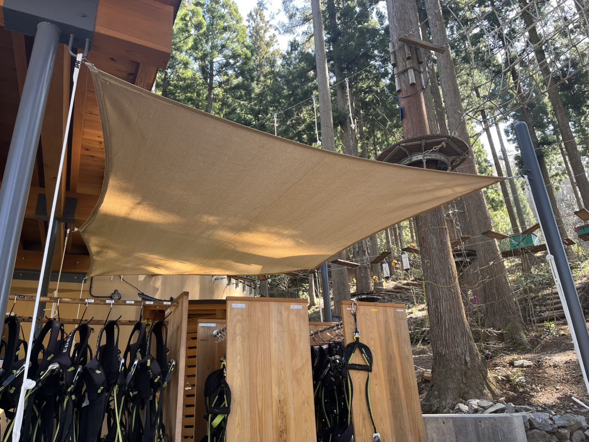 以上タープテントのご紹介でした。今回はアスレチック施設の屋外にて取付させてもらっております。最近ではキャンプや自宅でのBBQが流行っていると思いますが、日差しが強かったり、雨などから少しでも守りたいという方は是非タープテントなどはいかがでしょうか。