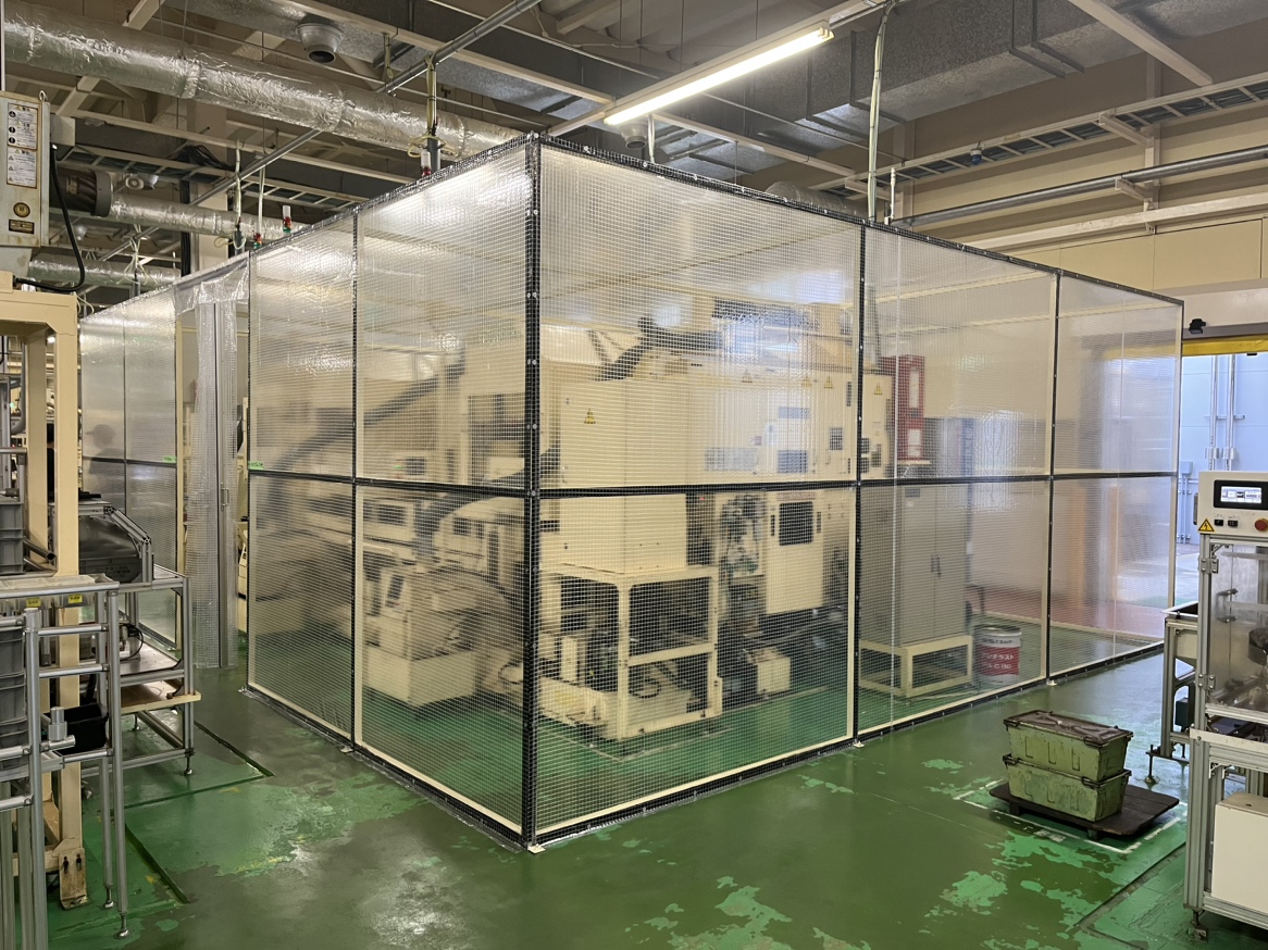 この度は某工場にて、W6200 奥行8000 H2700 程の密閉ブースを下地は軽量鉄骨、生地は透明糸入り防炎シートのテント生地にて取付させて頂きましたのでご紹介いたします。