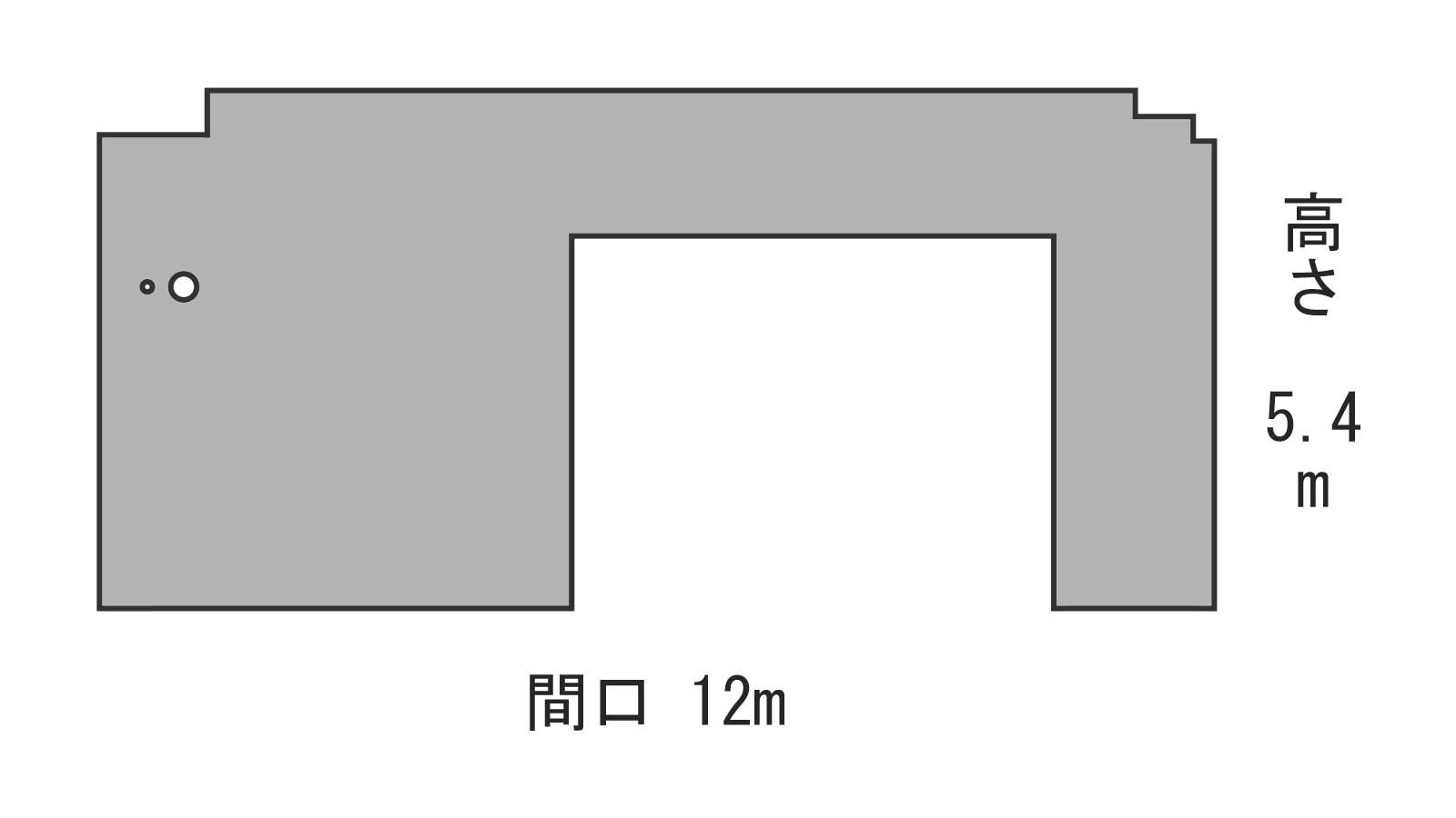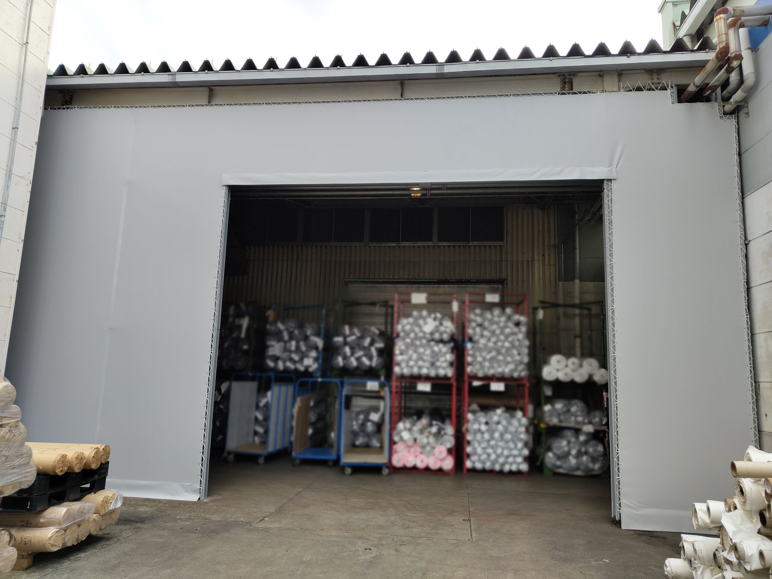 高さ:約5.4m・間口:約12mの大空間を覆う大規模なシート工事です。